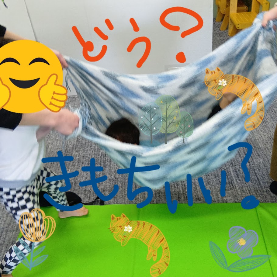 「もう一回」の要求にこたえたり、視線を合わせたりすることで大人との信頼関係を築きます。シーツに包まれることは胎内回帰のような安心感があり、精神安定にもつながります。